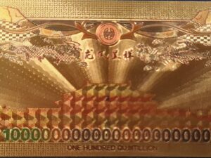 Sumérgete en la riqueza cultural y la magnificencia artística con el billete y caparazón de oro de cien quintillones de dólares, un tributo excepcional al Dragón y al Fénix de China. Esta pieza única es más que una adquisición; es una celebración de la prosperidad, la buena fortuna y la rica herencia cultural china.