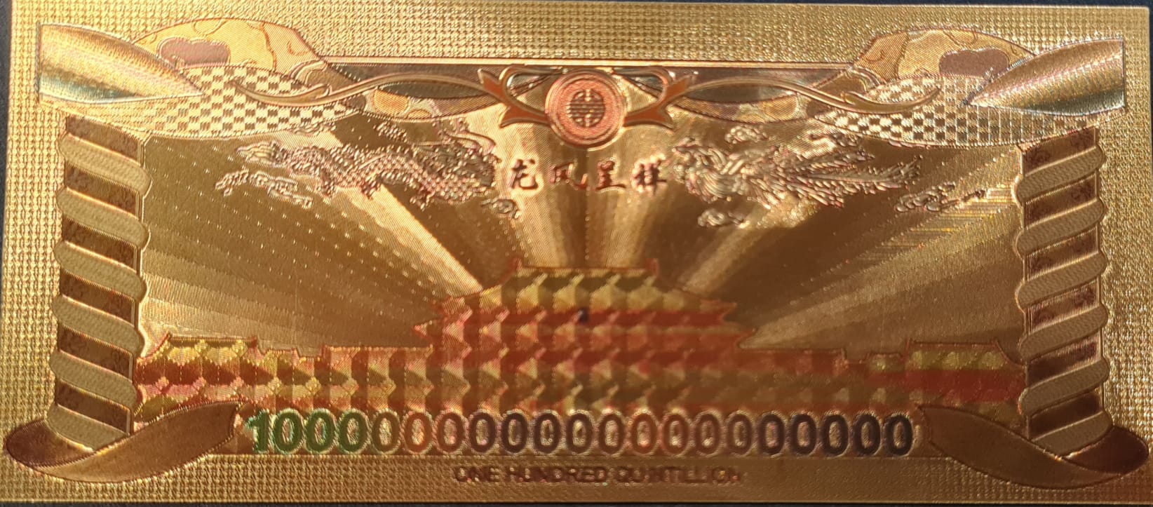 Bienvenido a la grandiosidad encapsulada en el billete y caparazón de oro de cien quintillones de dólares, una maravilla que presenta el impresionante diseño del Dragón y el Fénix de China. Esta obra maestra numismática combina la opulencia del oro con la rica simbología cultural, ofreciendo una experiencia única para los coleccionistas más exigentes.